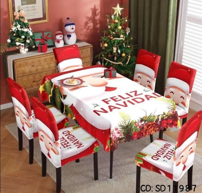 Mantel Navideño + 06 Forros Funda De Silla Decoración Navidad Pack 7unds